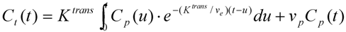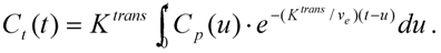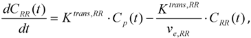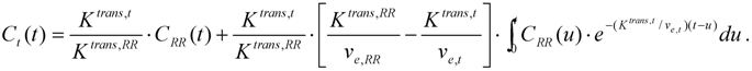 where Ktrans,RR and ve,RR are the appropriate quantitative parameters for the reference region tissue, CRR is the measured concentration of CA in the reference region tissue, and Cp is the plasma concentration of the blood. The set of equations allows for elimination of Cp, and the solution of the resulting differential equation is given by [95]: