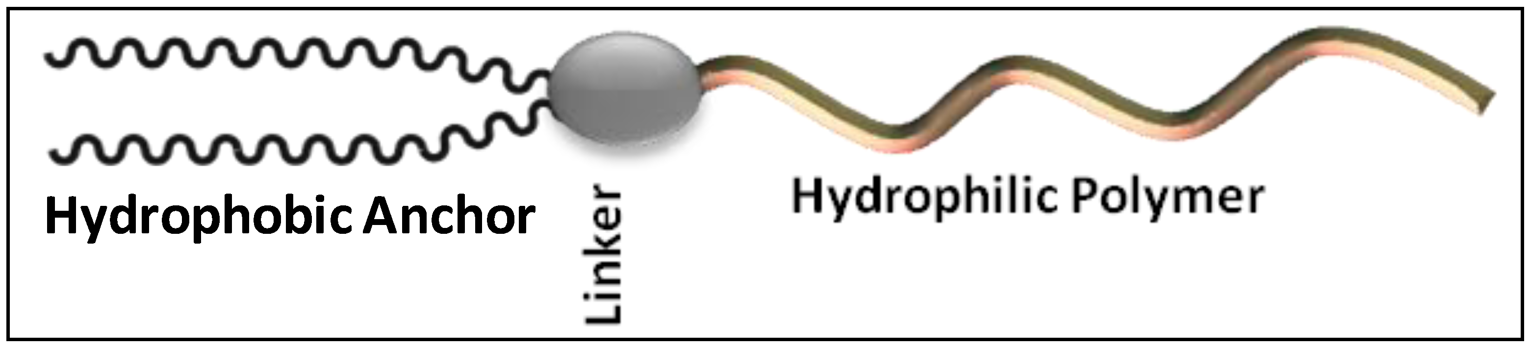 As a logical replacement of natural materials, various synthetic polymers have emerged that have been exploited to achieve the prolonged circulation time of the liposomes. The key common characteristics of the most successful polymers include biocompatibility, ease of synthesis, low fouling, flexibility and aqueous/organic solubility. For use in the constitution of liposomes, these polymers are converted into lipopolymers by attaching a lipophilic portion to their inherently hydrophilic domain (Figure 1). The resultant lipopolymers differ in their ionic charge and hydrophilic/lipophilic balance. In the following text, we discuss the lipopolymeric substances that have been historically used and some newly developed substances for the surface modification of liposomes.