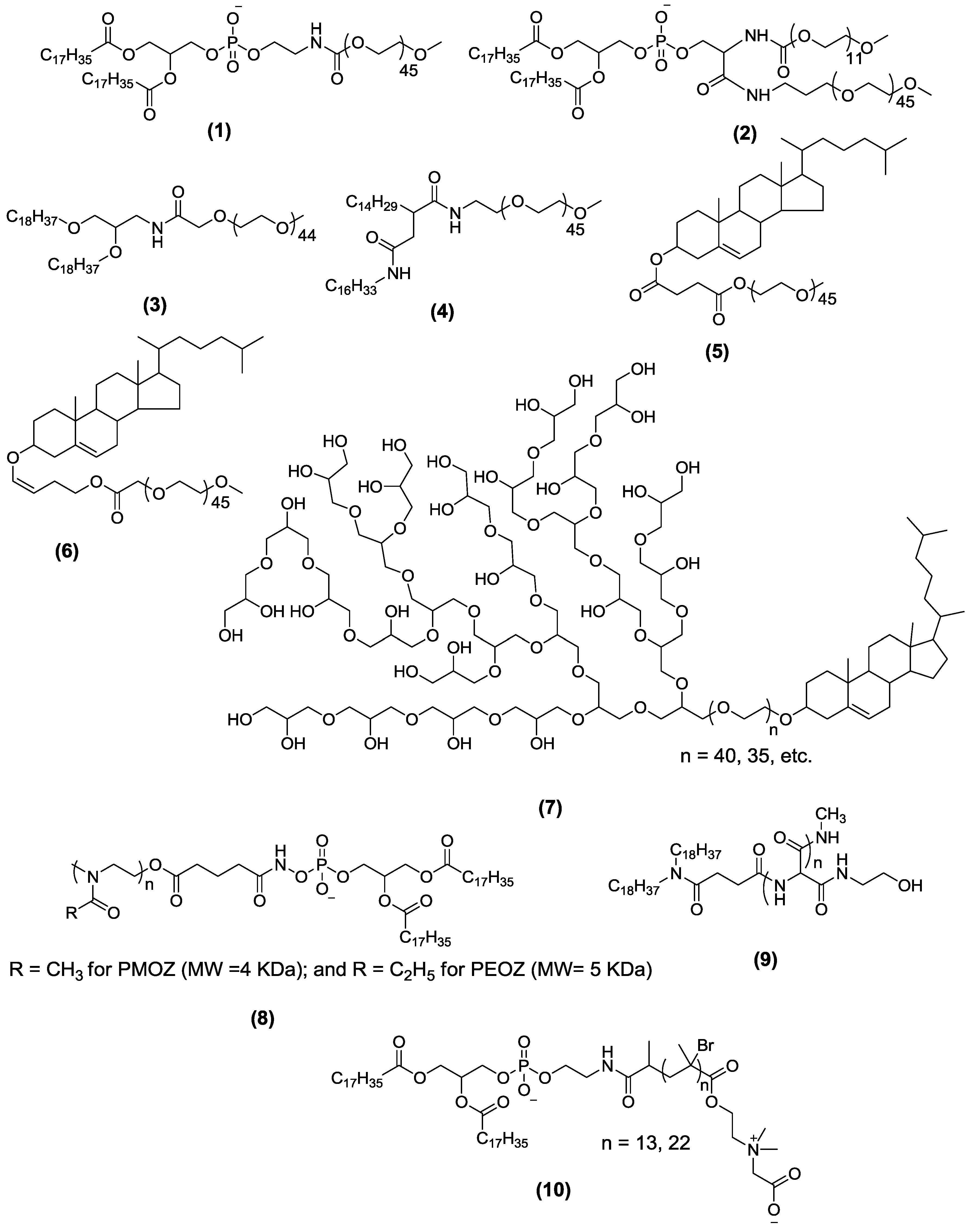 Chemical structures of representative lipopolymers containing different polymers, linkers and acyl chains. For more details about the degree of polymerization or values of n, the reader may refer to the references mentioned in the text. DSPE-PEG2000 (distearoyl-poly(ethylene glycol)) (1); PEG2000-DSPE-PEG500 (2); 1,2-distearyloxypropyl-3-amine-PEG2000 (3); hexadecylcarbamoylmethyl hexadecanoate-PEG2000 (4); cholesteryl hemisuccinate-PEG2000 (5); photocleavable cholesteryl-PEG2000 (6); cholesterol-hyperbranched polyglycerol (7); poly(2-methyl-2-oxazoline) (PMOZ)- or poly(2-ethyl-2-oxazoline) (PEOZ)-DSPE (8); poly(hydroxyethyl-l-asparagine)-succinyldioctadecylamine (9); DSPE-poly(2-tert-butoxy-N-(2-(methacryloyloxy)ethyl)-N,N-dimethyl-2-oxoethanamonium) (10).