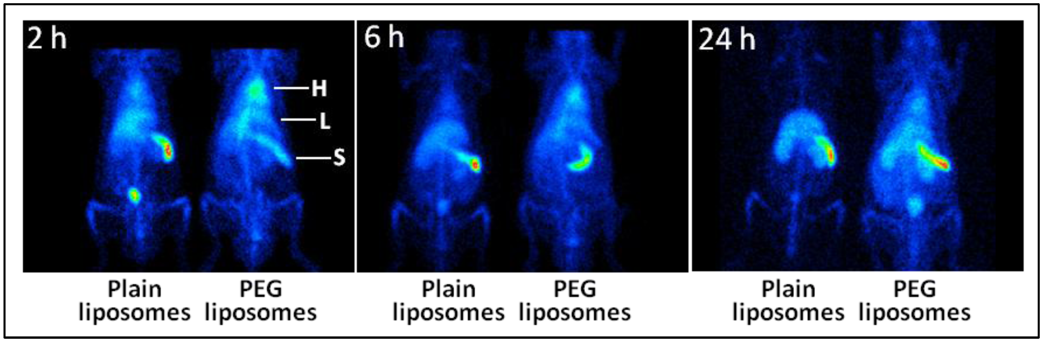 The effect of PEGylation on the circulation persistence of liposomes. As described elsewhere [35], liposomes consisting of DSPC (1,2-distearoyl-sn-glycero-3-phosphocholine)/Chol (cholesterol)/DMPG (1,2-dimyristoyl-sn-glycero-3-phosphoglyerol)/α-tocopherol, 45:44.8:10:0.2 mol%, were PEGylated with hexadecylcarbamoylmethyl hexadecanoate-PEG. The liposomes were labeled with Tc-99m, administered in rats, and the rats were imaged with a gamma camera over 24 h. As is evident from the heart (H) image signal, the PEG-liposomes remained in circulation even 24 h post-injection. The accumulation in the liver (L) and the spleen (S) was also lower in the case of PEG-liposomes, as compared to the plain liposomes.