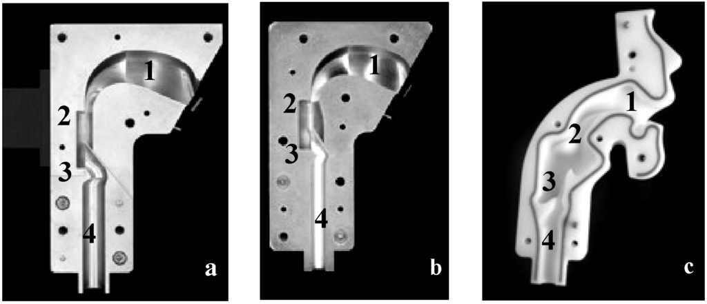 Physical upper airway models including the different regions 1, oral cavity; 2, pharynx; 3, larynx; and 4, trachea. (a) idealized adult upper airway model; (b) idealized pediatric upper airway model representing 4–5 years old children; and (c) realistic pediatric upper airway model representing 4–5 years old children.