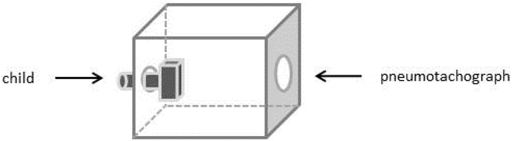 Schematic presentation of the experimental setup for the generated time-varying inhalation profile; on the left side the pediatric patient; in the middle the Cyclohaler® incorporated in an air tight plastic box; on the right side the pneumotachograph.