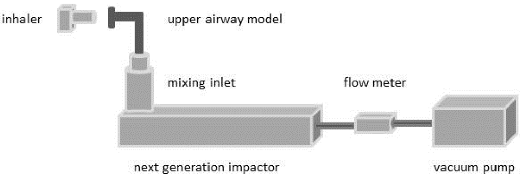 According to the standard method of the European Pharmacopeia (Ph. Eur. 2.9.18) for the aerodynamic assessment of fine particles, the experimental setup consisted of a next generation impactor (NGI, Copley Scientific Limited, Nottingham, UK) including a conventional inlet and preseparator. A flow meter (TSI 4000, TSI, Aachen, Germany) and a vacuum pump were used to provide a steady flow rate. The inhalation volume was adjusted by the process time to each flow rate.