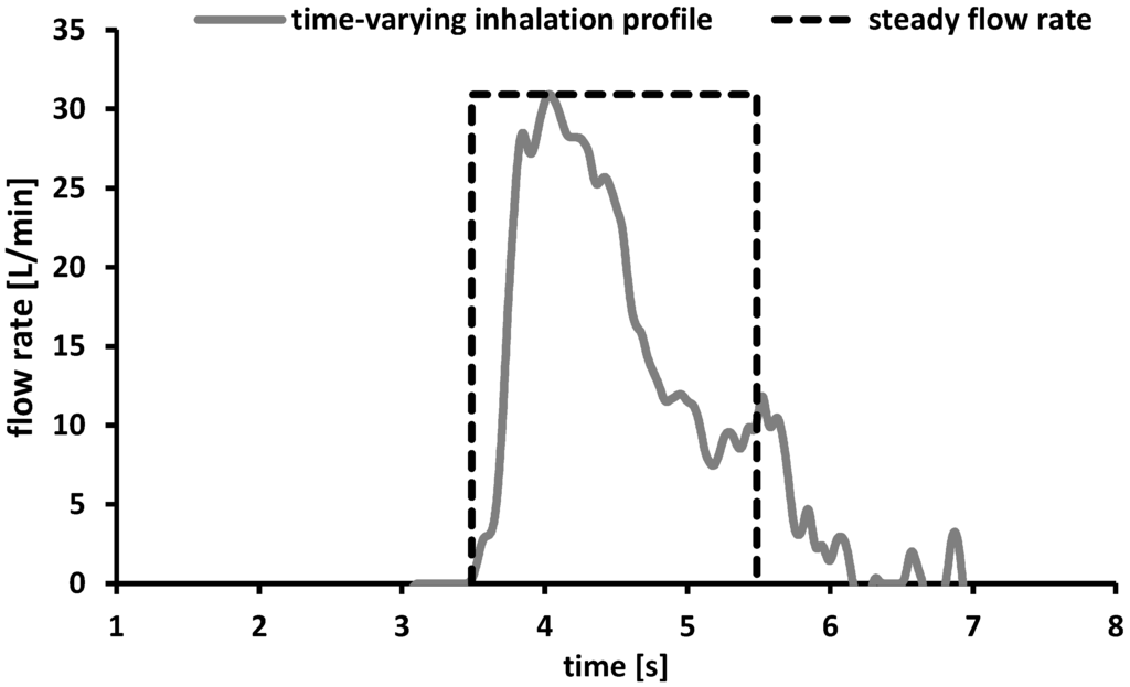 To get an indication of the differences between steady flow rates and time-varying inhalation profiles, a systematical presentation of a steady flow rate proceed (30 L/min, volume 1 L) is given above (Figure 4). The maximum flow rate was achieved directly after starting the process and formed a plateau until the end of the process (regulated by the adjusted inhalation volume) and subsequently dropped down rapidly.