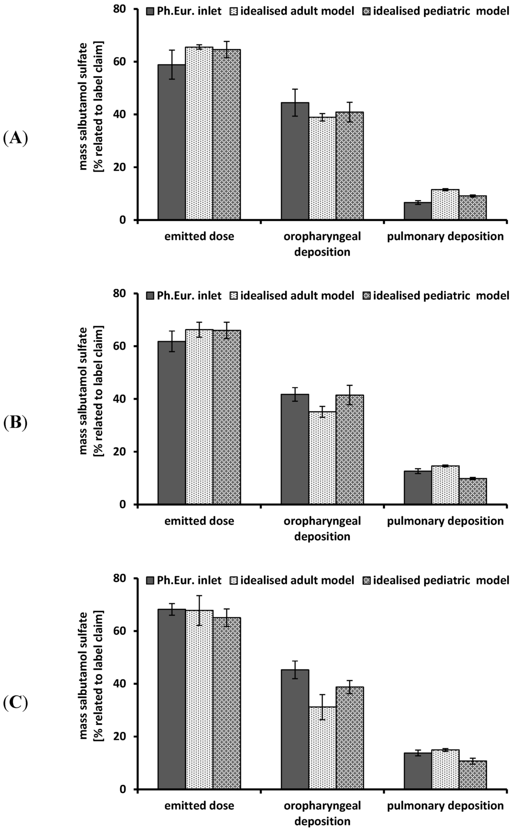 The pulmonary deposition showed no influence induced by the oropharyngeal deposition and the emitted dose. The idealized pediatric upper airway model resulted in a lower pulmonary deposition compared to the Ph. Eur. inlet and the idealized adult model (except Ph. Eur. inlet using 30 L/min). At a steady flow rate of 60 L/min, a higher pulmonary deposition was achieved for the Ph. Eur. inlet (13% ± 0.9%) and the idealized adult upper airway model (15% ± 0.4%) compared to the idealized pediatric model (9% ± 0.4%). By increasing the steady flow rate from 30 to 75 L/min an enhancement of the pulmonary deposition could be obtained. The Ph. Eur. inlet showed the highest increase from 7% ± 0.7% to 14% ± 1.1%. The idealized adult upper airway model exhibited a rise from 11% ± 0.4% to 15% ± 0.5%. The pulmonary deposition using the idealized pediatric model was slightly increased from 9% ± 0.4% to 11% ± 1.1%. This relies on stronger deaggregation processes as consequence of higher energy values caused by higher flow rates.