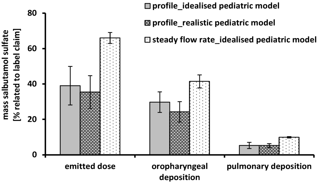 Another part of the present investigations was the comparison of steady flow rates against the time-varying inhalation profile. Regarding the emitted dose, a high difference between the two inhalation conditions could be observed. The amount of delivered API was 39% ± 10.9% using the inhalation profile and 66% ± 3.1% with the steady flow rate of 60 L/min. These results could possibly be explained by the different flow rates achieved in the DPI and the upper airway models accompanied by an additionally inhomogeneity proceed of the flow rate during the inhalation of the child. The maximum PIF was reached only for a short time of about 0.1 s and led to an insufficient and varying deflation of the capsules incorporated in the device. The oropharyngeal deposition was slightly higher under steady conditions (41% ± 3.7%) compared to the inhalation profile (30% ± 5.8%) and is mainly generated by a flow-dependent high intensity of particle impaction. However, this effect could be counterbalanced by a higher amount of particles smaller than 5 μm (pulmonary deposition) in the case of the steady flow rate. Despite of equal conditions in the NGI (steady flow rate of 60 L/min), there was an increase in pulmonary deposition from 5% ± 1.8% up to 10% ± 0.4% by using a steady flow rate of 60 L/min instead of the inhalation profile (maximum PIF of 30 L/min). The main reasons for this finding has been the enhanced deaggregation of the powder particles primarily occurring in DPI as result of the higher flow rate [34,35] and the much higher emitted dose for steady flow rates.