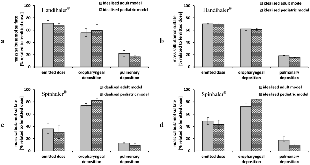 Performance of Handihaler® and Spinhaler® using the idealized adult (grey columns) and pediatric (dashed black columns) upper airway models and steady flow rates; (a) Handihaler® 30 L/min; (b) Handihaler® 60 L/min; (c) Spinhaler® 30 L/min; and (d) Spinhaler® 60 L/min; emitted dose, oropharyngeal deposition and pulmonary deposition were related to emitted dose; mean ± SD, n = 3.