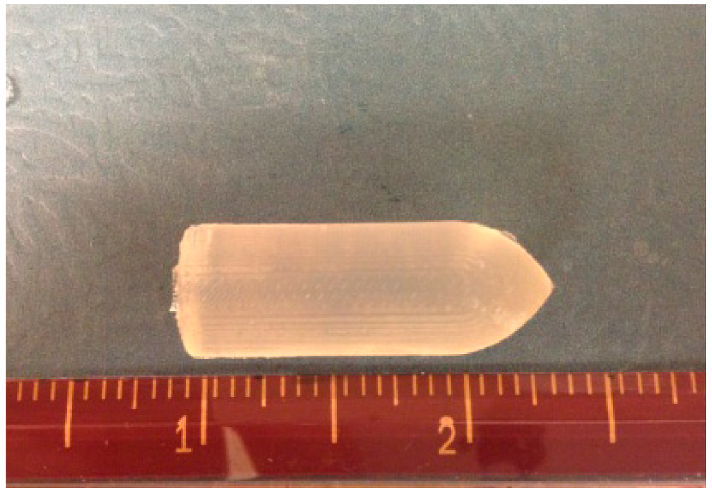 Based on previous acceptability studies, 4 firmness levels ranging in G’ from 250 to 25,000 Pa (25 °C) were selected [15]. To prepare gels of constant firmness with different elongation properties, the types and amounts of ι- and κ-carrageenan were varied, as was the amount of potassium chloride (Table 1). Gels were prepared by mixing the dry ingredients (carrageenan and KCl) in deionized water and holding the mixture at 85 °C for at least 1 h. The gel was stirred intermittently till it formed a homogenous dispersion. Prior to preparing the suppositories, the gel was characterized in a rheometer to confirm the storage modulus closely (within 10%) matched the desired value (Table 1) at 25 °C. Small deformation rheological measurements were performed at a frequency of 1 Hz and strain of 1% on a strain-controlled oscillatory rheometer (ARES, TA Instrument, New Castle, DE, USA) using a cone and plate geometry (probe diameter = 25 mm, cone angle = 5.73°). The gel was loaded between the plates when hot (80 °C) and the edges sealed with a light coating of mineral oil to prevent moisture evaporation. Data were recorded first on cooling to 15 °C, followed by heating to 60 °C at a rate of 5 °C per minute. Bullet shaped suppositories (Figure 1) were prepared by filling plastic syringes with the hot gel and injecting it into acrylonitrile butadiene styrene molds, followed by cooling in a refrigerator (4 °C) for 15 min and holding at room temperature for at least 2 h in sealed glass vessels to allow the gels to set [17,29]. Samples were presented in 0.75 oz Solo transparent plastic cups (Solo Cup Company, Urbana, IL, USA), kept at 25 °C with the lids sealed tightly until evaluated.