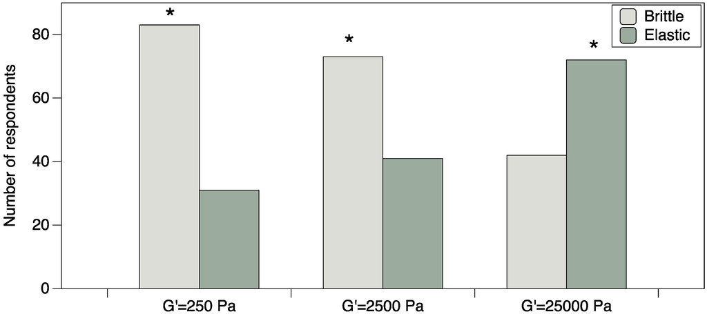 Elasticity and Firmness interact to influence women’s preference. At the lower firmness levels, brittle samples are preferred, whereas at higher firmness the elastic sample is preferred. Asterisks (*) indicate a significant difference for the paired comparison using a binomial test (p < 0.05).
