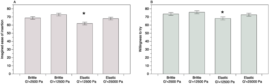 Effect of firmness and texture on (A) imagined ease-of-insertion and (B) willingness-to-try, which were measured on a 100 point visual analog scale. Indented semantic anchors at 10 (e.g., “not at all willing”) and 90 (e.g., “extremely willing”) were provided to minimize scale end avoidance bias. Asterisks (*) indicate a significant difference at α = 0.05 (Tukey’s Honest Significant Difference (HSD)).