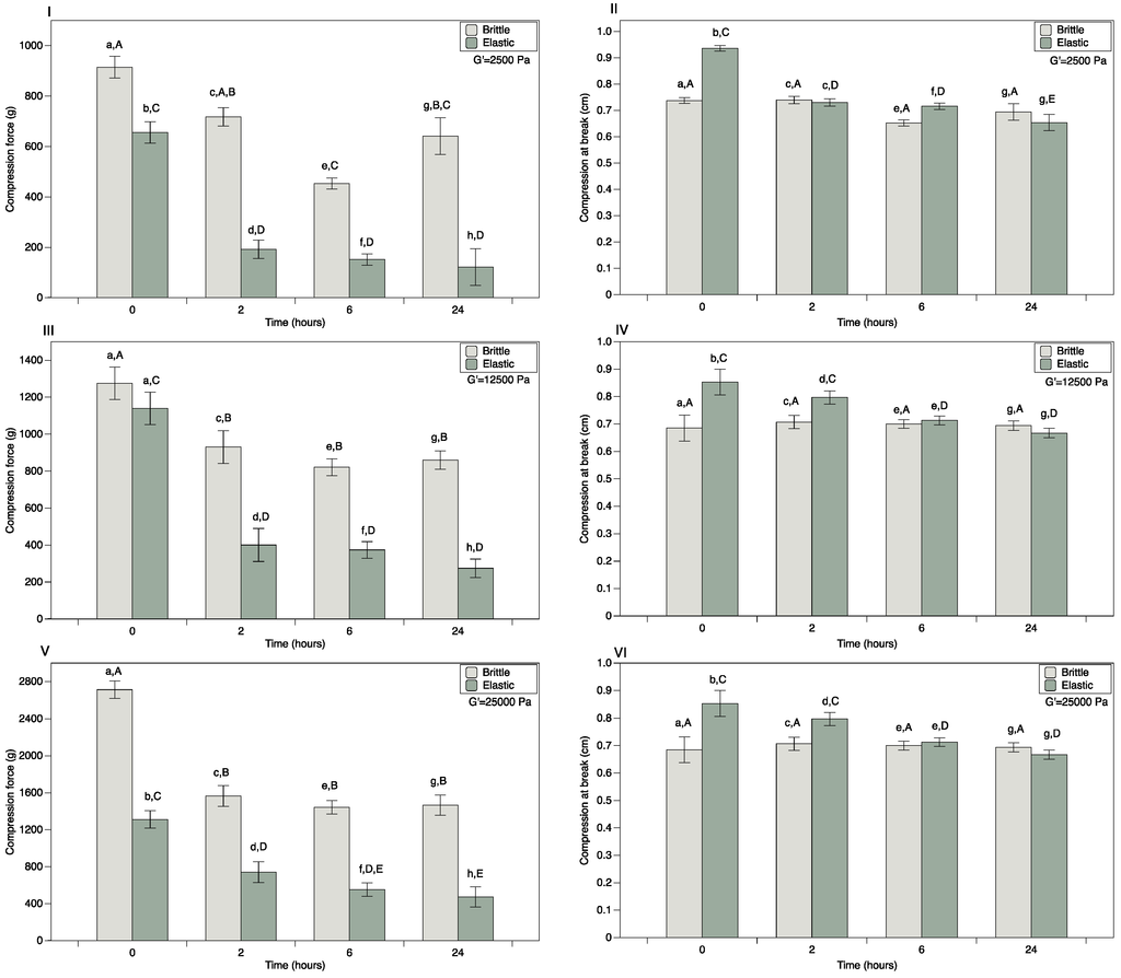 Compression force required to break spherical suppositories and compression at break after suppositories have been in contact with vaginal simulant fluid (VSF) from 0–24 h. Compression force required to break the ovule and the deformation at fracture are plotted for G’ = 2500 Pa (I,II), G’ = 12,500 Pa (III,IV) and G’ = 25,000 Pa (V,VI). Lower case letters denote statistically significant differences between brittle and elastic suppositories at the specific time point. Upper case letters denote statistically significant differences (p < 0.05) between time points for the same suppository type (brittle and elastic).