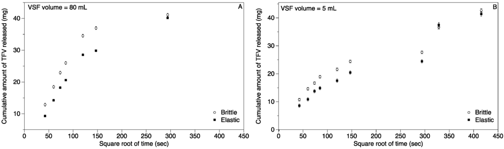 The initial TFV release profile in VSF (0–2 h) showed a linear relationship between the cumulative release of TFV and the square root of time. The slope of the linear portion of the line (0–2 h) was used to calculate the rate of TFV diffusion (Table 5). There was a significant difference in the rate of diffusion between the brittle and elastic suppository types for both dissolution volumes (80 and 5 mL) with a higher diffusion rate for brittle suppositories. Also for both suppository types, the diffusion rate in 80 mL VSF was higher than in 5 ml VSF (Table 5).