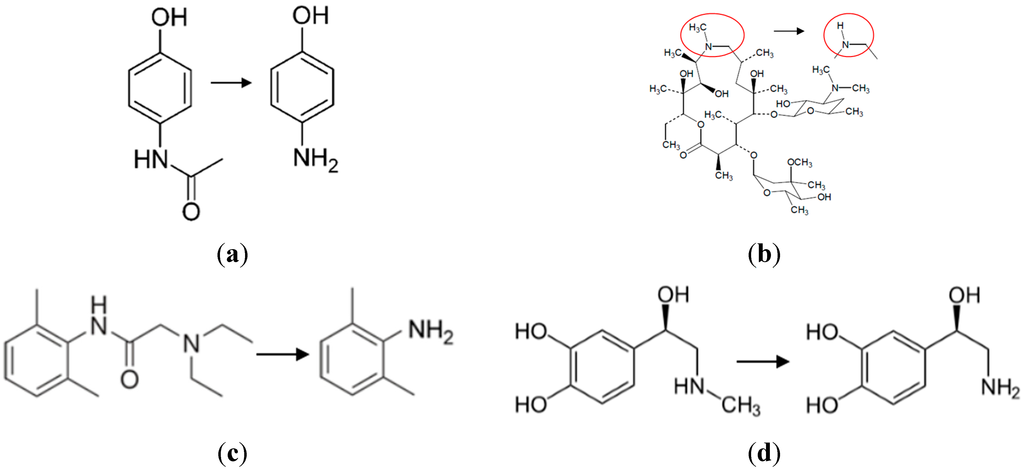 The chemical structures of the four drugs and their primary degradation products. (a) acetaminophen to p-aminophenol; (b) azithromycin to azaerythromycin A; (c) lidocaine to 2,6-dimethylaniline; and (d) epinephrine to nor-epinephrine.