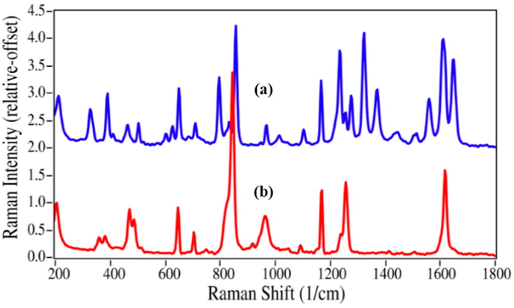 (a) Raman spectra of (a) Lidocaine (intensity × 5); and (b) 2,6-dimethylaniline. Spectral conditions as in Figure 2.