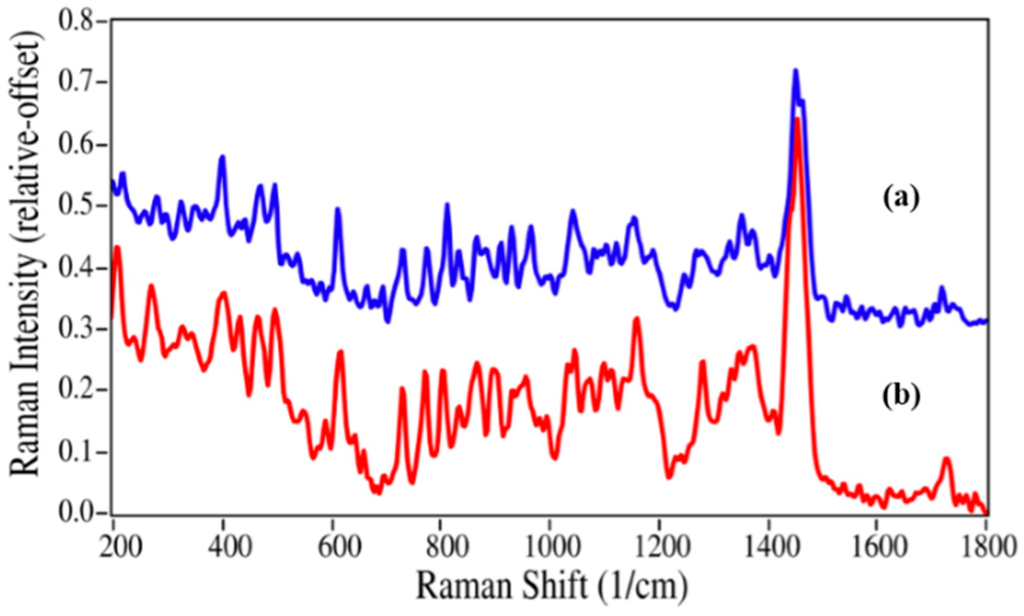 Since azithromycin has numerous methyl groups, the replacement of one group at the nitrogen position of the oxo-6-azacyclopentadecyl ring by a hydrogen atom, as expected, produced only minor changes in the Raman spectrum (Figure 5). The Raman spectrum is dominated by a peak at 1454 cm−1 due to the ether stretching modes, while a number of CC and CNC stretching, and CH bending modes appear between 600 and 1200 cm−1 [35]. Within this region minor changes do occur; in particular, the peak at 814 cm−1 loses intensity and shifts to 805 cm−1. While the spectral differences between epinephrine and nor-epinephrine may be sufficient to quantify a mixture, it is clear that the differences between azithromycin and azaerythromycin A may not.