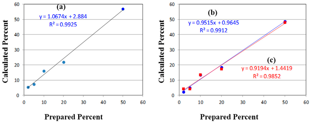 (a) Plots of Prepared versus Calculated percentages of p-aminophenol mixed with acetaminophen determined using (a) the Raman peak height at 846 cm−1; and the 550–1800 cm−1 Raman spectral region using (b) raw spectra (circles), and (c) first derivatives of the spectra (squares). Ideally, the slope should equal 1.0 and the intercepts 0.0.