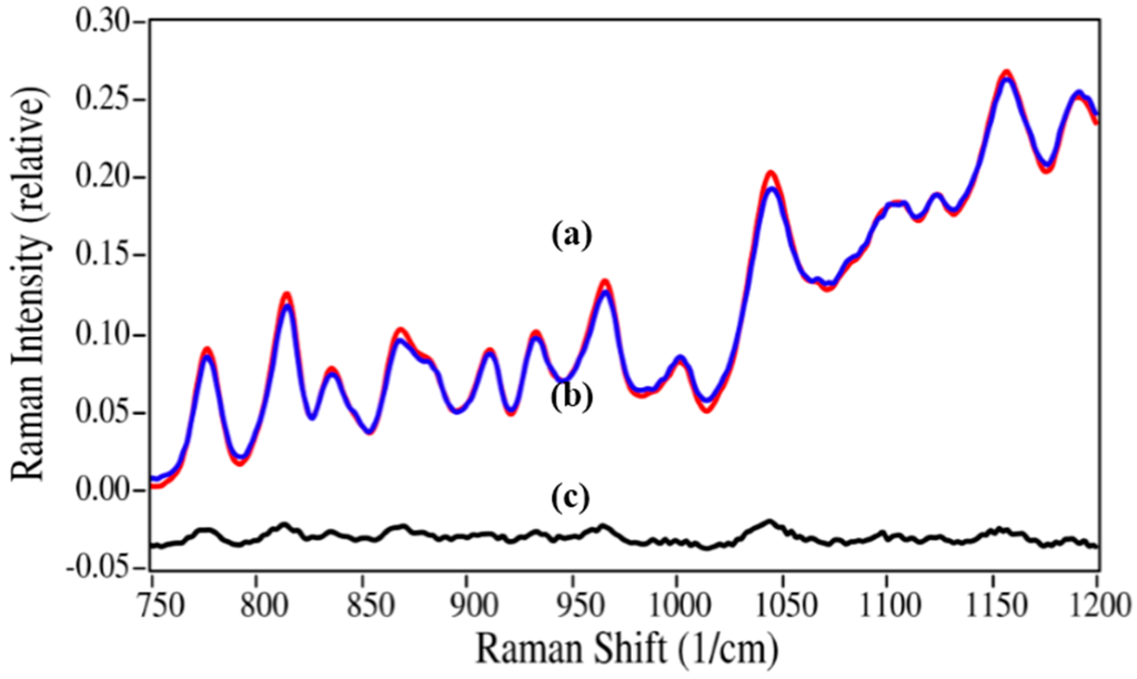 Raman spectrum of (a) the 5%/95% azaerythromycin A/azithromycin mixture (red) fit with (b) a spectrum created using 4.3% azaerythromycin A and 95.7% azithromycin of their pure spectra; (c) The residual of the fit (a–b). Spectral conditions as in Figure 6, except 565 to 1220 cm−1 region used.