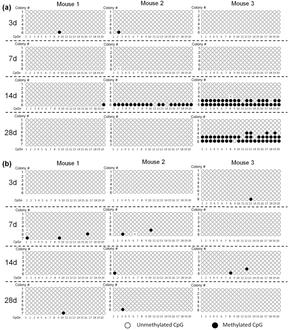 Methylation status of cytomegalovirus (CMV) promoter (a) and luciferase cDNA (b) in pCMV-Luc. Mice were hydrodynamically injected with 100 μg pCMV-Luc. DNA was extracted from mouse liver on day 3, 7 14 and 28 after the hydrodynamic injection of pCMV-Luc and subjected to bisulfite sequencing. Each circle represents one CpG dinucleotide. Six to eight colonies were randomly selected from the liver samples of each mouse, and were numbered. CpG # represents the location of CpGs in the amplified promoter or cDNA parts, with #1 being the nearest to the 5′-end. The positions that could not be read were indicated with X.