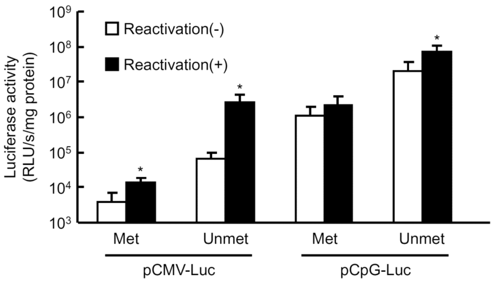 It has been reported that silenced transgene expression is reactivated by hydrodynamic injections of isotonic solutions [1,2]. However, it is not clear whether the reactivation is mediated by methylated or unmethylated plasmid DNA. To further clarify the correlation of methylation and silenced transgene expression, the reactivation experiment was carried out using both methylated and unmethylated plasmids. The pCMV-Luc or pCpG-Luc in either unmethylated or methylated form was injected into mice by the hydrodynamic injection method, and a large volume of saline was injected into the mice 3 days later to reactivate the silenced transgene expression (Figure 2). The level of expression from the methylated pCMV-Luc was much lower than that of the unmethylated counterpart, and the saline injection resulted in a moderate (about 3.7-fold) increase in the expression. On the other hand, the same treatment increased the expression up to about 40-fold when the unmethylated pCMV-Luc was administered. The increase in the expression produced by the second saline injection was 3.5- and 1.9-fold for the unmethylated and methylated pCpG-Luc, respectively. The difference in the luciferase activity between unmethylated and methylated pCpG-Luc would be due to the methylation of CpGs in the luciferase cDNA.