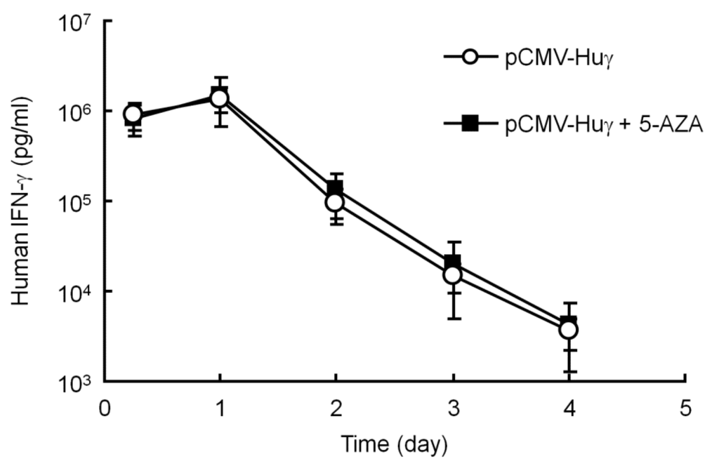 The compound, 5-AZA, an inhibitor of DNA methylation, was employed to confirm whether plasmid DNA is methylated or not in mouse liver after hydrodynamic injection. pCMV-Huγ (a human IFN-γ expressing plasmid) was injected into mice by the hydrodynamic injection method with or without intraperitoneal injections of 5-AZA at a dose of 0.25 mg/kg every 2 days. Figure 3 shows the concentration of human IFN-γ in the mouse serum after gene transfer. There were no significant differences in the levels of human IFN-γ between the two groups, suggesting that pCMV-Huγ is hardly methylated during this period. Taken together with the results shown in Figure 1 and Figure 2, it is reasonable to conclude that plasmid DNA is hardly methylated in mouse liver after hydrodynamic injections at least for the first couple of weeks.