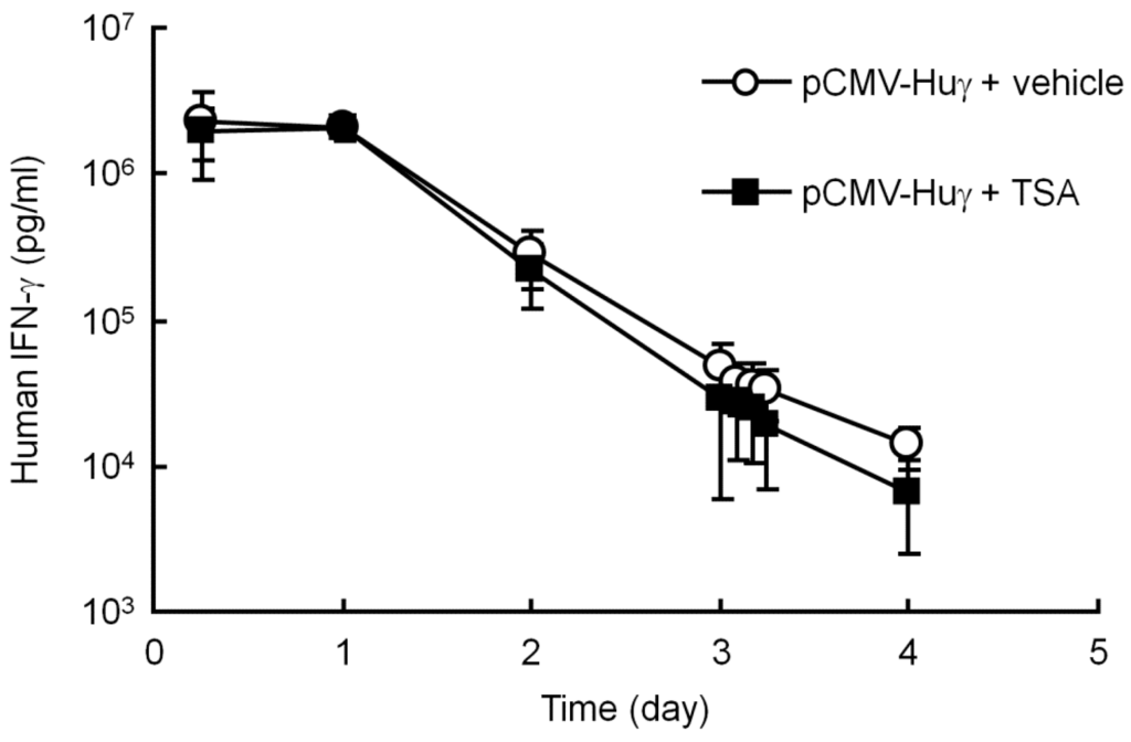 Effect of trichostatin A (TSA) on the serum concentration of human IFN-γ after injection of pCMV-Huγ. pCMV-Huγ was hydrodynamically injected into mice at a dose of 20 μg/mouse. On day 3, mice received an intraperitoneal injection of vehicle or TSA at a dose of 10 mg/kg. The concentrations of human IFN-γ in the serum were measured at the indicated time points. The results are expressed as the mean ± SD of four mice.