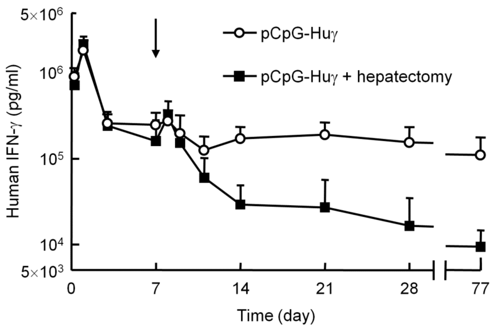 Effect of partial hepatectomy on the serum concentration of human IFN-γ after injection of pCpG-Huγ. pCpG-Huγ was hydrodynamically injected into mice at a dose of 0.1 μg/mouse. On day 7, a group of mice received a partial hepatectomy (indicated with an arrow). The concentrations of human IFN-γ in the serum were measured at the indicated time points. The results are expressed as the mean + SD of four mice.