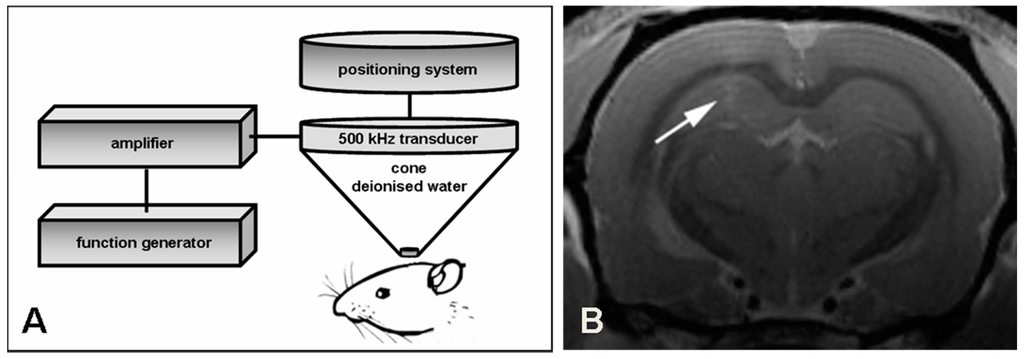 Schematic drawing of BBB opening with focused ultrasound and verification with MRI. (A) One hemisphere of male Wistar rats is insonated with a 500 kHz transducer adapted to a stereotactic positioning system. The transducer is driven by a function/arbitrary waveform generator and amplifier; (B) Successful opening of the BBB is demonstrated with magnetic resonance imaging 30 min after insonation. Gadolinium-enhanced T1-weighted images show a slight contrast enhancement in the focus of the insonation site (see arrow).