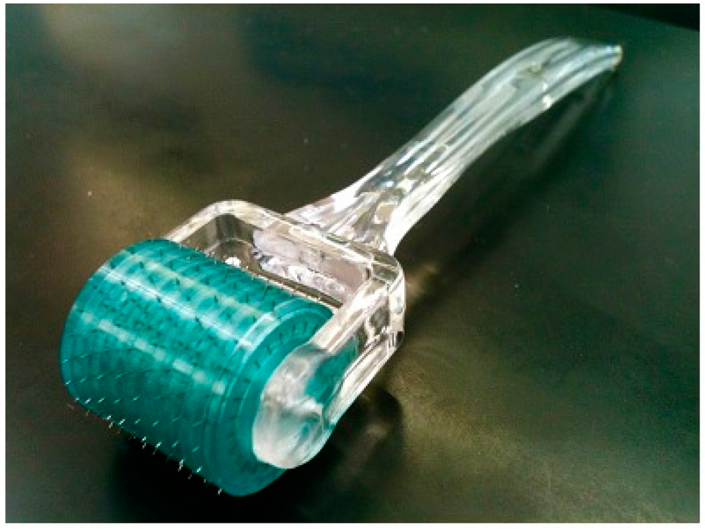 - Badran, M.M.; Kuntsche, J.; Fahr, A. Skin penetration enhancement by a microneedle device (Dermaroller) in vitro: Dependency on needle size and applied formulation. Eur. J. Pharm. Sci. 2009, 36, 511–523. [Google Scholar] [CrossRef] [PubMed]
