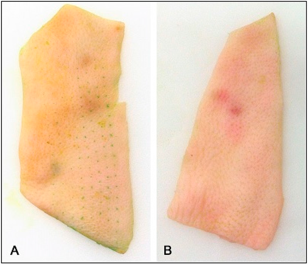 Microchannel visualization using margin marking dye. (A) Porcine skin treated with microneedle roller. (B) Non-treated porcine skin as the control.