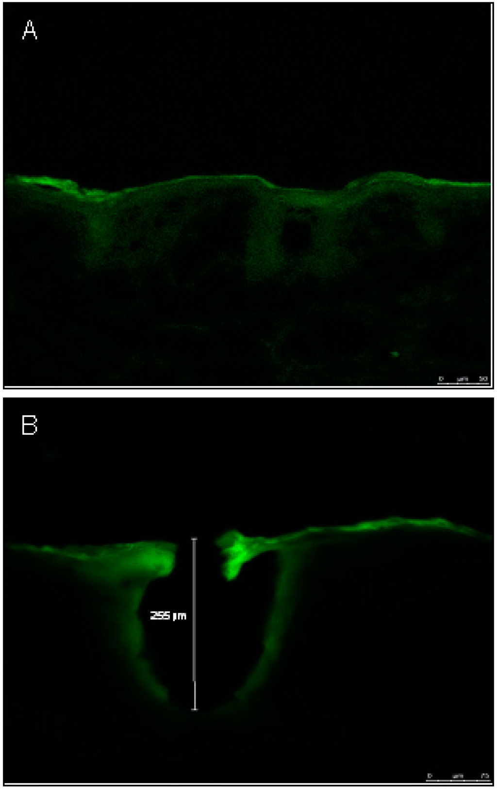 Representative depth of a single microchannel by confocal laser scanning microscopy (CLSM). (A) Untreated porcine skin. (B) Microneedle treated porcine skin showing a microchannel depth of 255 μm.