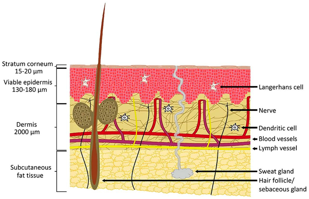 Skin is the most accessible and largest organ of the body with a surface area of 1.7 m2, compromising 16% of the total body mass of an average person [16,17,18]. The main function of the skin is to provide a protective barrier between the body and the external environment against microorganisms, the permeation of ultraviolet (UV) radiation, chemicals, allergens and the loss of water [19]. Skin can be divided into three main regions: (1) the outermost layer, the epidermis, which contains the stratum corneum; (2) the middle layer, the dermis and (3) the inner most layer, the hypodermis (Figure 1) [5,20,21].