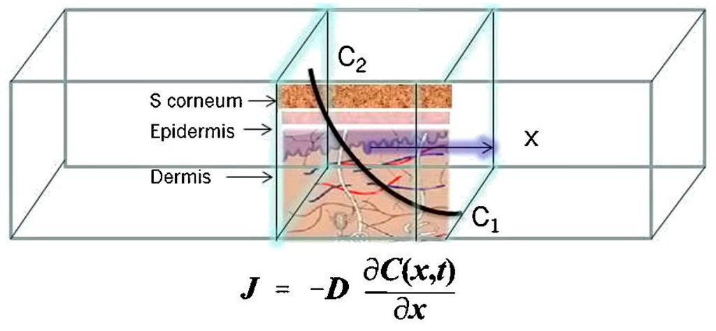 In delivery systems involving transdermal patches, the drug is stored in a reservoir (reservoir type) or drug dissolved in a liquid or gel-based reservoir (matrix type).The starting point for the evaluation of the kinetics of drug release from a transdermal patch is an estimation of the drug compound’s maximum flux across the skin (flux (J)) which is typically expressed in units of μg/cm2/h) (Equation 1) (Figure 3). Based on Fick’s law of diffusion, the transport of therapeutic molecules across skin will be maintained until the concentration gradient ceases to exist [33,34,35].