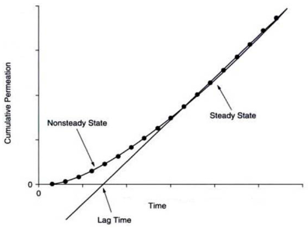 The permeability coefficient (P) can be obtained from the slope of a plot of cumulative permeation of diffusant vs. time obtained from an experimental permeation study. A typical plot of permeation study is shown in Figure 4.