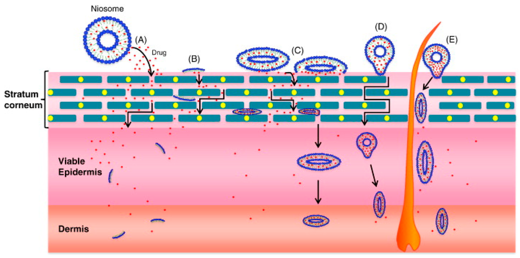 Possible mechanisms of action of surfactant vesicles for dermal and transdermal applications: (A) drug molecules are released by niosomes; (B) niosome constituents act as penetration enhancer; (C) niosome adsorption and/or fusion with stratum corneum; (D) intact niosome penetration through the intact skin; (E) niosome penetration through hair follicles and/or pilosebaceous units. (Reprinted from [46] with permission. Copyright 2014 Elsevier).