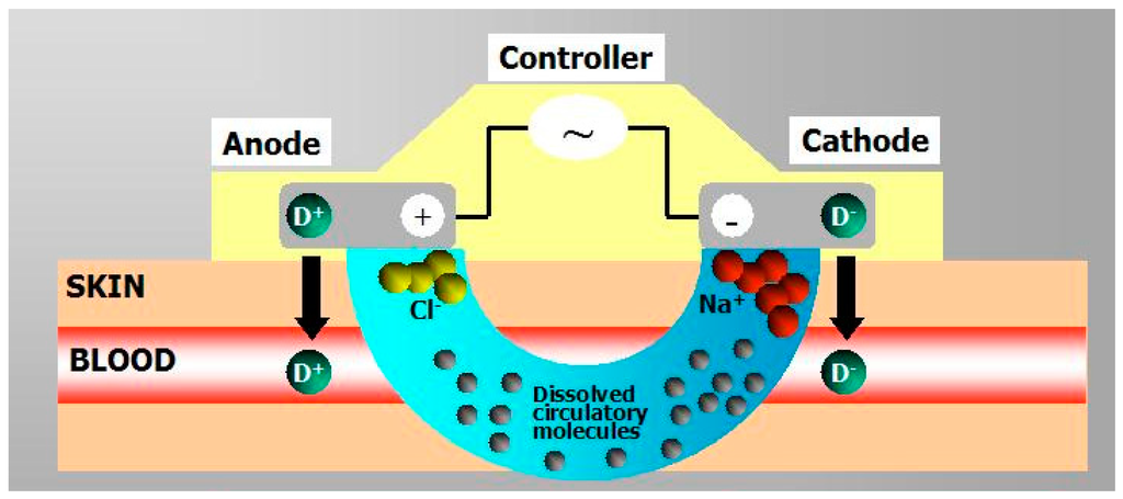 The applications of iontophoresis can be classified into therapeutic and diagnostic applications. Iontophoresis has been used in various diagnostic applications e.g. diagnosing cystic fibrosis [87] and recently for monitoring blood glucose levels [88].The major advantage of iontophoresis in diagnostic applications is that there is no mechanical penetration or disruption of the skin involved in this approach [89,90].