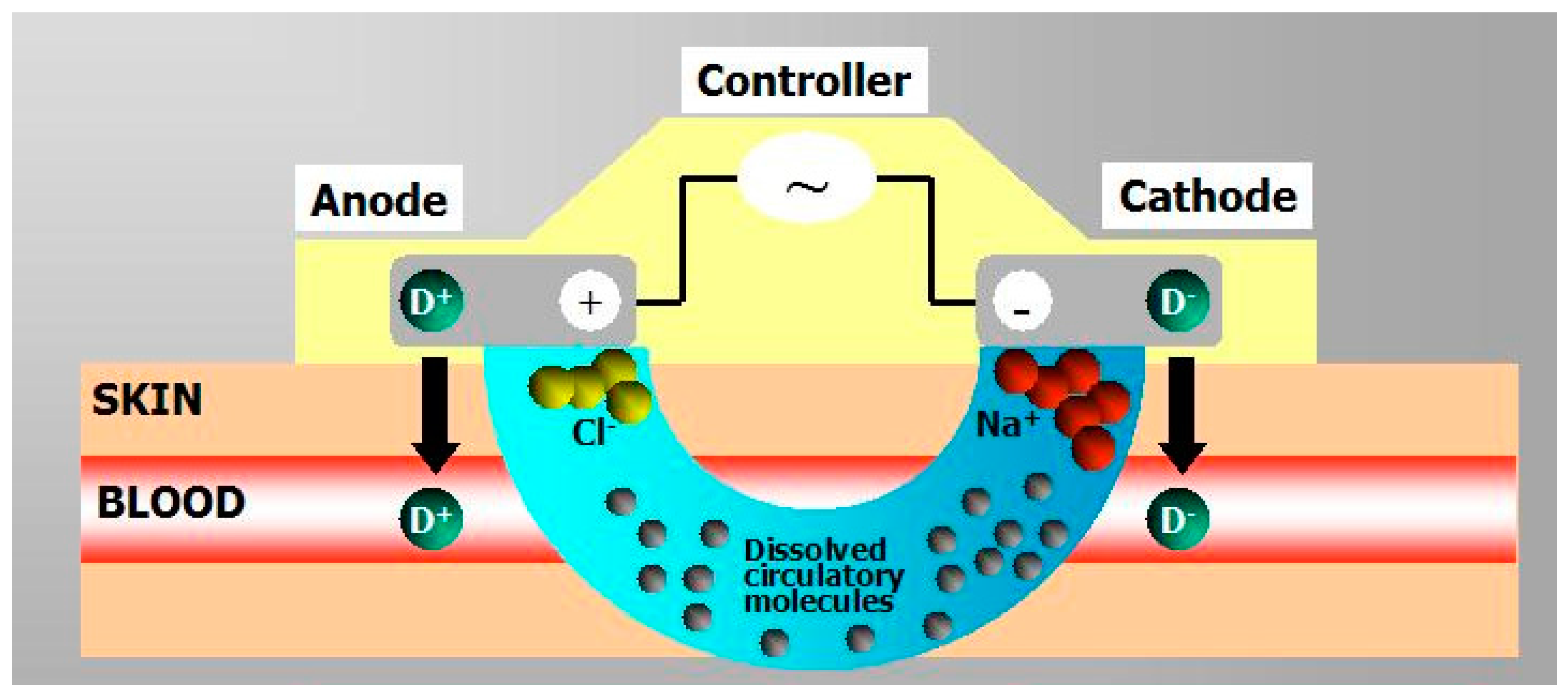 - Krueger, E.; Claudino Junior, J.L.; Scheeren, E.M.; Neves, E.B.; Mulinari, E.; Nohama, P. Iontophoresis: Principles and Applications. Fisioterapia Movimento 2014, 27, 469–481. [Google Scholar] [CrossRef]