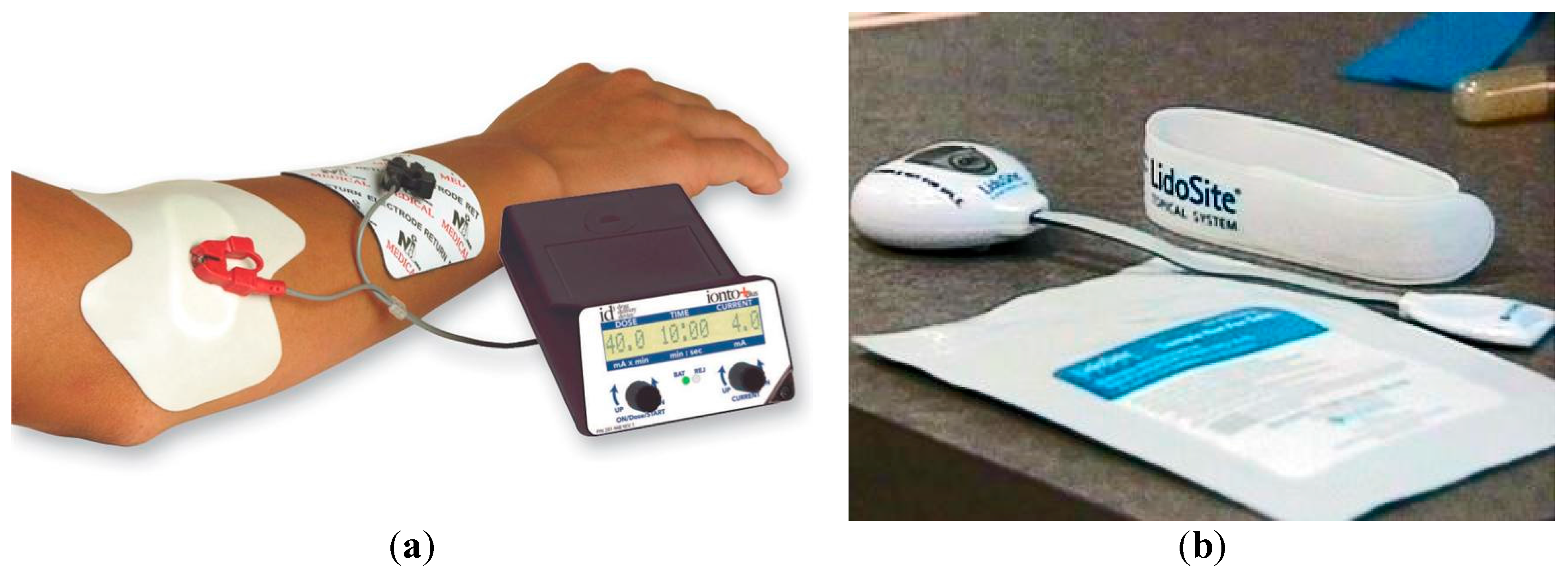 - Dhote, V.; Bhatnagar, P.; Mishra, P.K.; Mahajan, S.C.; Mishra, D.K. Iontophoresis: A Potential Emergence of a Transdermal Drug Delivery System. Sci. Pharm. 2012, 80, 1–28. [Google Scholar] [CrossRef] [PubMed]