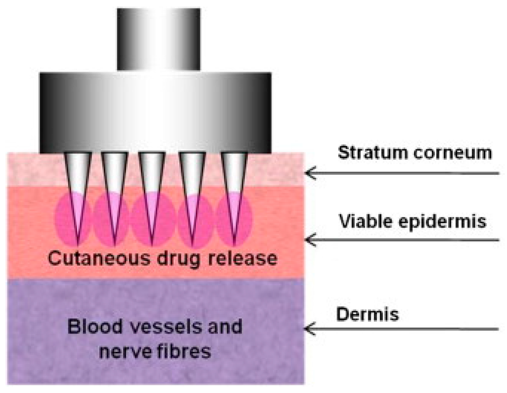 TDD is a painless method of delivering drugs systemically by applying a drug formulation onto intact and healthy skin [2,5]. The drug initially penetrates through the stratum corneum and then passes through the deeper epidermis and dermis without drug accumulation in the dermal layer. When drug reaches the dermal layer, it becomes available for systemic absorption via the dermal microcirculation [8,9]. TDD has many advantages over other conventional routes of drug delivery [10,11,12]. It can provide a non-invasive alternative to parenteral routes, thus circumventing issues such as needle phobia [2]. A large surface area of skin and ease of access allows many placement options on the skin for transdermal absorption [5]. Furthermore, the pharmacokinetic profiles of drugs are more uniform with fewer peaks, thus minimizing the risk of toxic side effects [2]. It can improve patient compliance due to the reduction of dosing frequencies and is also suitable for patients who are unconscious or vomiting, or those who rely on self-administration [13]. TDD avoids pre-systemic metabolism, thus improving bioavailability [2,4]. With reference to the use of the skin as a novel site for vaccination strategies, this organ is known to be replete with dendritic cells in both the epidermal and dermal layers which play a central role in immune responses making TDD an attractive vaccination route for therapeutic proteins and peptides [3,14]. The requirement for an inexpensive and non-invasive means of vaccination, especially in the developing world [3,14,15], has given rise to substantial research focused on the development of simple, needle-free systems such as TDD for vaccination purposes. This theme will be explored further in Section 4.5.2 of this review.