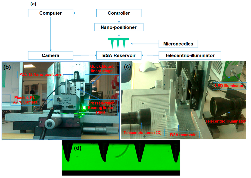 Nano-positioning dip coater: it was designed to restrict access of the coating liquid only to the microneedle shaft to prevent contamination of the base, to provide sufficient time to the microneedle inside the BSA reservoir and to slowly retract the MNs from the reservoir. To enable three-dimensional alignment and dipping of microneedle arrays into the reservoir, a piezoelectric nano-positioner (PZA12) were assembled on a cross-roller linear stage, which hold the microneedle arrays (Figure 2b). To view the whole dipping process a Pixelink PL-A776 3.1 mega pixel CMOS colour camera coupled with a 2× telecentric lens and a LED fibre optic telecentric illuminator were used. The coating was performed automatically using software Lab View (National Instruments, Austin, TX, USA).