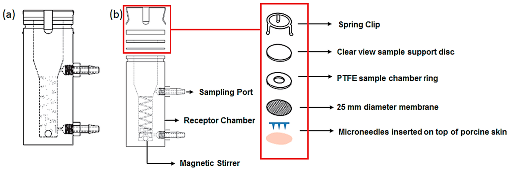 Schematic of the Franz diffusion experimental setup: (a) vertical diffusion cell; (b) exploded view of the cell and sample holder (adapted from www.copley.com).