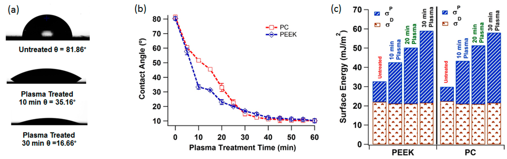 (a) Water contact angle PEEK before and after 10 and 30 min of oxygen plasma treatment; (b) graph showing water contact angle with plasma treatment time for PEEK and PC; (c) bar graph showing the polar (σP) and dispersive (σD) component of the surface energy of the three polymers before and after plasma treatment calculated using Owens/Wendt theory.