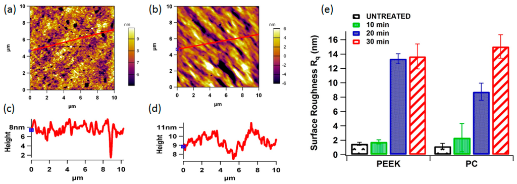 Representative 2D non-contact mode AFM images (10 µm × 10 µm) for untreated (a) PEEK and (b) PC; (c,d) surface roughness line profiles for untreated PEEK and PC; (e) bar graph showing the surface roughness of each polymer vs. plasma treatment time.