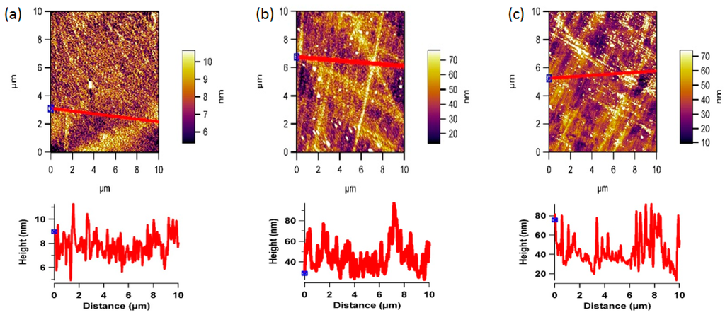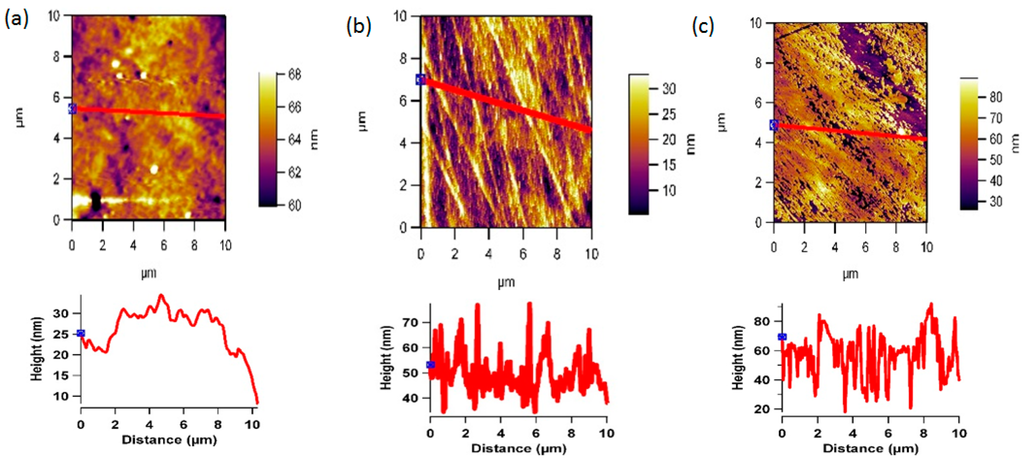 Atomic force microscope was used to examine the changes in the polymer surface before and after the plasma treatment process. All AFM scans were made using an MFP-3D scanner from Asylum Research, Santa Barbara, CA, USA. Silicon nitride cantilever tips (Applied Nanostructures, Santa Clara, CA, USA) with a tip radius of 15 nm and spring constant of 0.3 Nm were used. The scans were made on 10 µm × 10 µm scale and repeated five different times on five different area of the polymer film at a resolution of 512 × 512 pixels. Images were interpreted using integrated MFP-3D™ Igor software (Asylum Research, Santa Barbara, CA, USA). Errors in the piezo-linearity were corrected for by using zero and first order flattening. The scans were made on 10 µm × 10 µm scale and repeated five different times on five different area of the flat polymer surface.