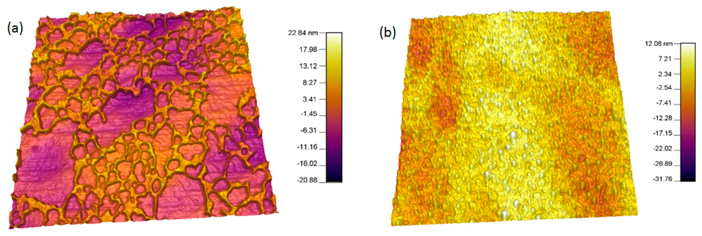 The morphologies of the two experimental untreated polymeric surfaces are shown in Figure 5a,b, as viewed by the AFM. This is a local probe technique that reveals local structural features, which are not necessarily representative for the whole sample surface. Due to this reason, an appropriate way to record and process many images from different areas of the surface was used. This furnishes local structure information with high resolution, but also enables to determine a mean behaviour. The representative AFM images of untreated polymer surfaces and scans were made on 10 µm × 10 µm scale and repeated five times and average surface roughness was used. All the evaluations that are described in the following have, thus been carried out quantitatively and averaged over a large number of pictures recorded in different areas of the samples. The mean surface roughness Rq of untreated PEEK and PC were 1.51 and 1.61 nm, respectively. This confirms that the surfaces were relatively smooth for all polymers, which is important for surface characterisation.