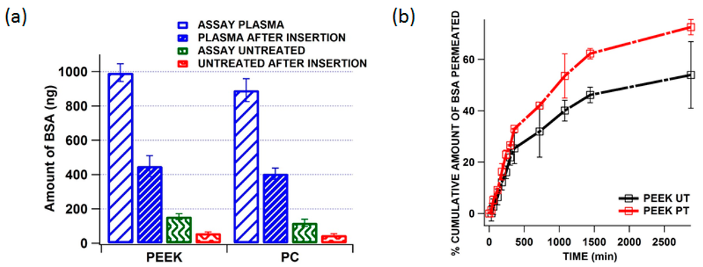 Solid MNs are generally used for proteins and vaccine delivery and the efficiency of these MNs depends on how quick the coated formulation is released from MNs to the skin. In this study we quantify and compare the residual BSA that is left in the untreated and plasma treated MN shaft after insertion onto porcine skin for 15 min. Figure 9a shows the amount of BSA loaded (assay) and residual (after insertion) to untreated and treated MNs of PEEK and PC. It is evident that the plasma treated MNs could load up to 1 µg of BSA and the residual amount after insertion was found to be 428 ng that means 572 ng of BSA was been delivered into the skin in first 15 min whereas in the case of untreated MNs could only load 183 ng and the residual amount after insertion was found to be 64 ng which means 119 ng of BSA was delivered into skin from the untreated MNs. From this it was observed that the amount of BSA loaded was more in the case of plasma treated MNs and just over half the amount was released but the in the case of the untreated MNs even though the initial loading was 5.7 times over than the plasma treated MNs the proportion of the original amount which was delivered to the skin was slightly higher (65% vs. 57.2%). This is because plasma along with increasing the surface energy of the polymer surfaces it also increases the adhesion of BSA to the MN shafts resulting in a reduced release rate.