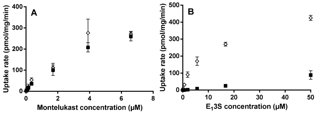 Concentration-dependent uptake of montelukast (A) and E13S (B) in HEK-OATP2B1 (◊) and HEK-mock (■) at pH 6.5. Results are given as mean ± S.D., n = 3.