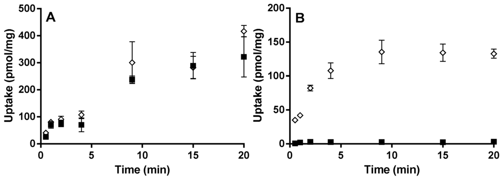 Time-dependent uptake of (A) 1 µM montelukast and (B) 1 µM E217βG in HEK-OATP1B1 (◊) and HEK-mock cells (■) at pH 7.4. Results are given as mean ± S.D., n = 3.