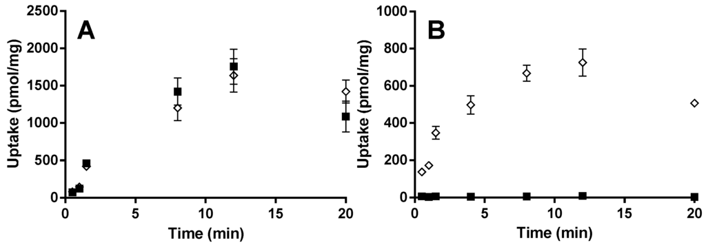 Time-dependent uptake of (A) 1 µM montelukast and (B) 0.5 µM E13S at pH 7.4 in HEK-OATP2B1 (◊), and HEK-mock cells (■). Results are given as mean ± S.D., n = 3.
