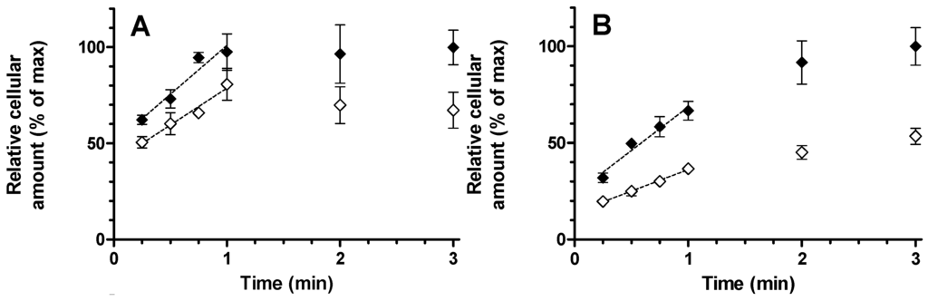 Time-dependent uptake of (A) montelukast and (B) E13S into human hepatocytes. Incubations were performed with substrate alone (♦) and in the presence of 10 µM rifampicin (◊). Relative initial uptake rates were assessed from linear fit to data obtained from 15 to 60 s (dashed). Results are given as mean ± S.D., n = 3.