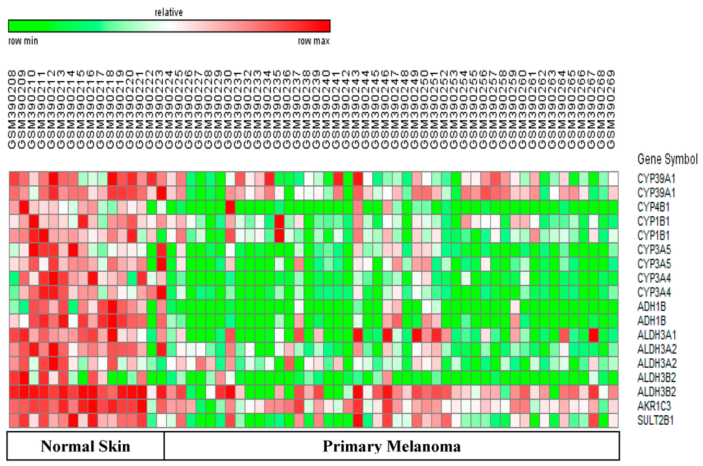 Heatmap of DEGs from GSE 15605. Melanomas showed downregulation of phase II genes controlling vitamin A degradation (AKR1C3), antioxidant defense (ALDH3A1, ALDH3A2, ALDH3B2, ADH1B), and cholesterol catabolism (CYP39A1). Genes metabolizing arachidonic acid (CYP4B1) and drugs (CYP4B1, CYP1B1, CYP3A5, and CYP3A4) were down-regulated in melanomas. Genes with high and low expression are rendered in red and green, respectively. Multiple entries for certain genes arise when different probe sets on the original array recognize an expressed gene.